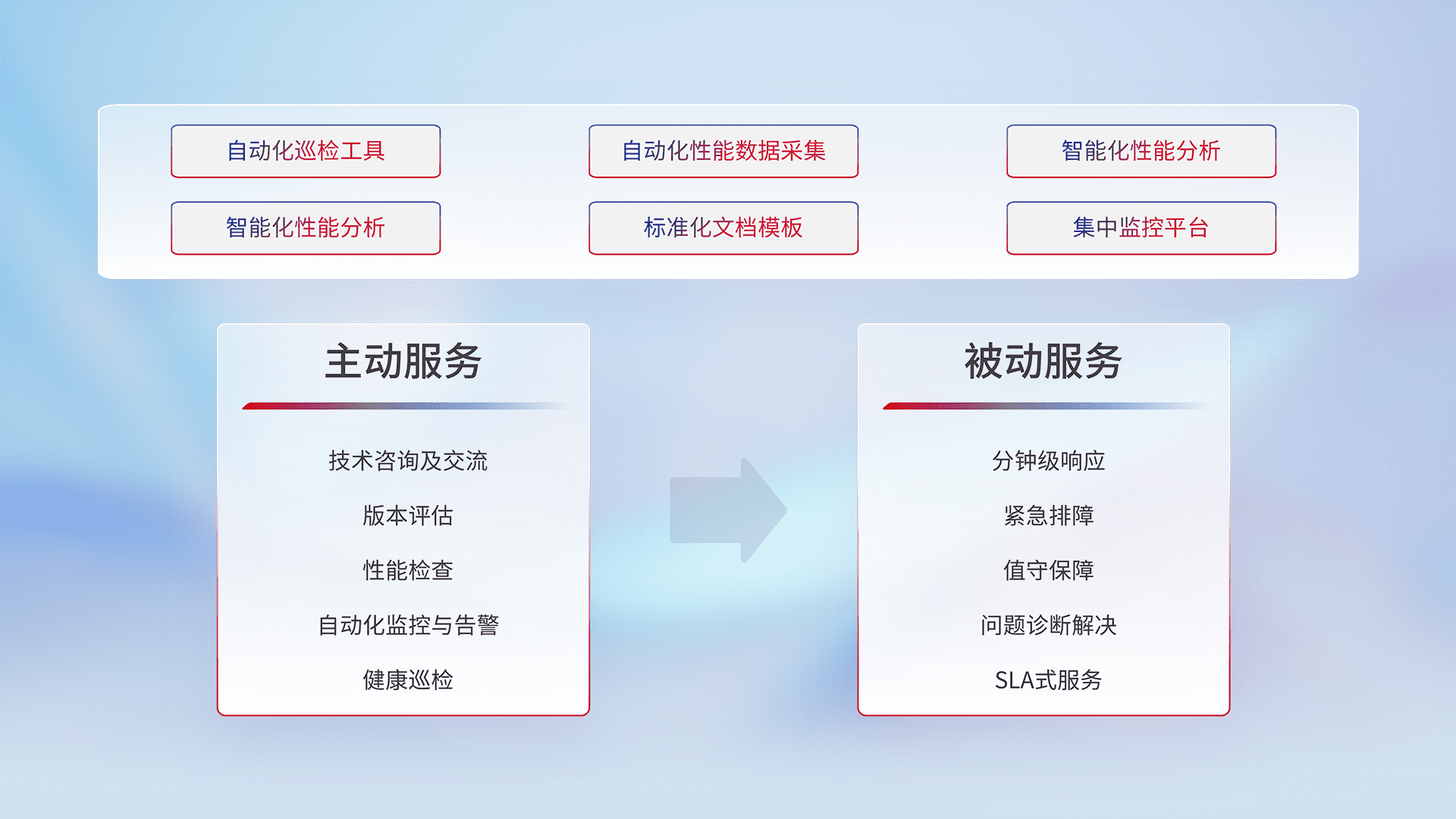 智能化工具和标准化文档,,保障服务质量,,,提供主动服务(包含技术咨询、、、版本评估、、、、性能检查、、、自动化监控与告警、、、健康巡检)和被动服务包含(分钟级响应、、紧急排障、、、值守保障、、、、问题诊断解决、、SLA服务)。。。